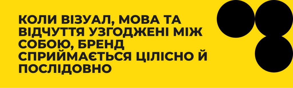 • Однак візуал не працює сам по собі. Паралельно з ним функціонує вербальна айдентика — те, як бренд говорить і формулює свої думки. Вона охоплює лексику, ритм мовлення, стиль текстів, слогани та Tone of Voice. Саме вербальна складова допомагає бренду вибудовувати характер у комунікації: бути стриманим або емоційним, експертним або дружнім, формальним чи неформальним. Через мову бренд доносить свої цінності та вибудовує довіру.